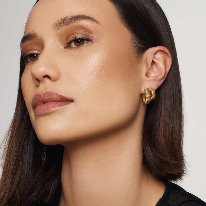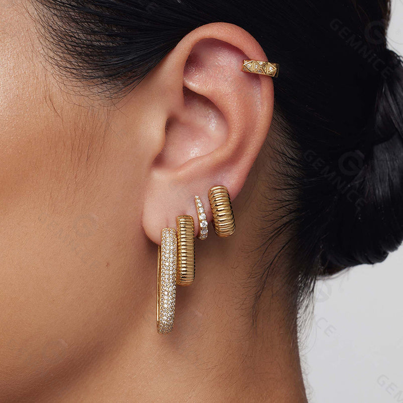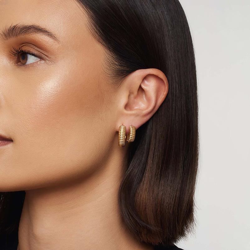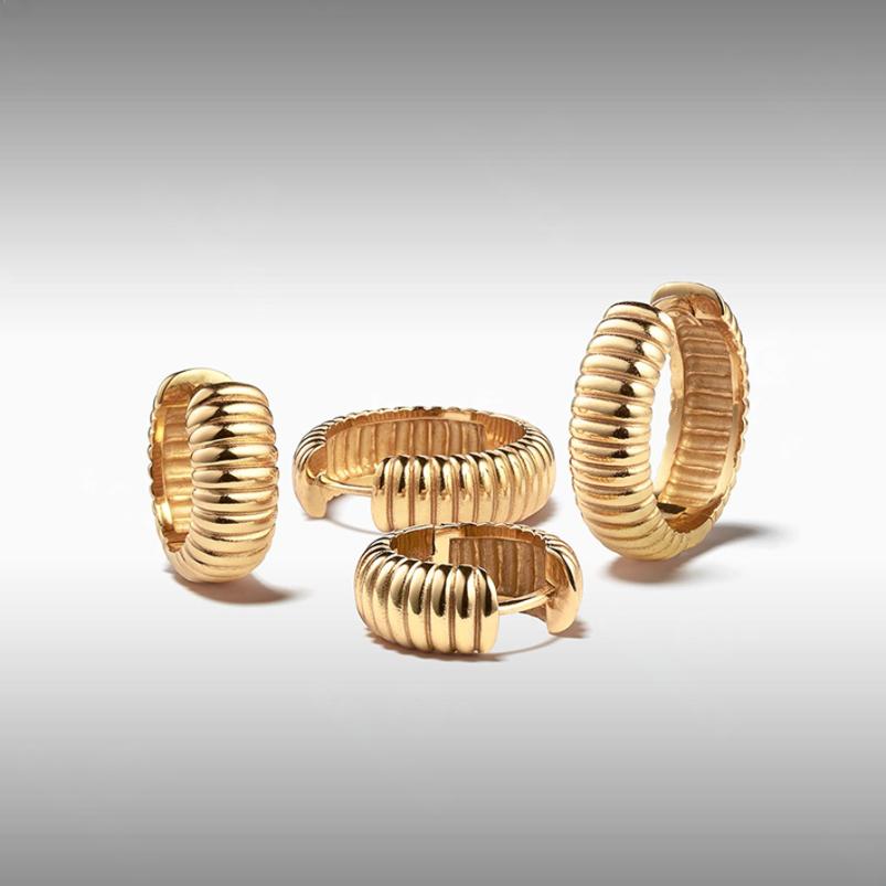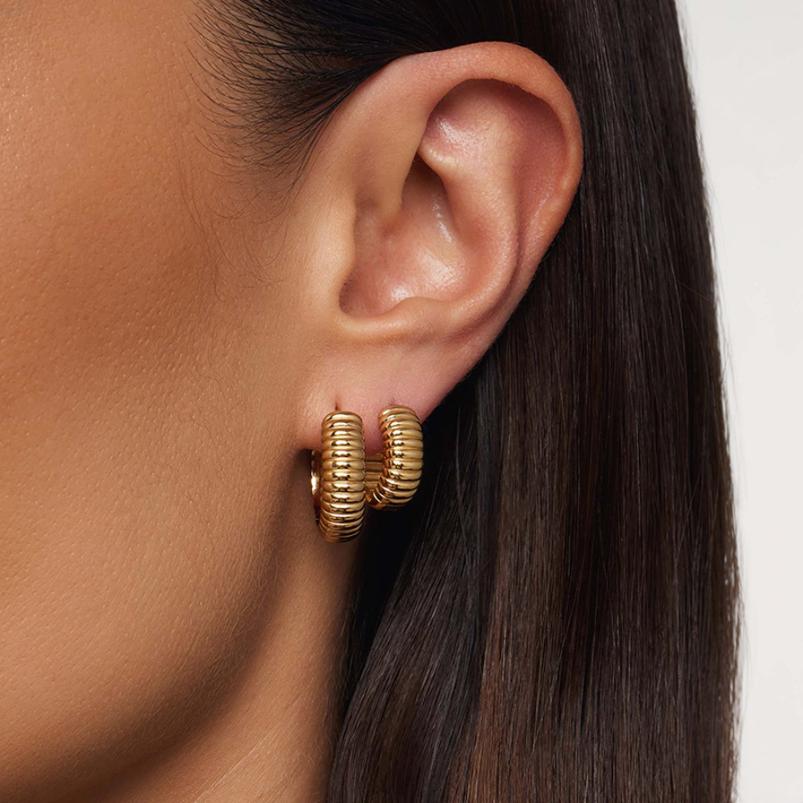 Crafted from high-quality 925 sterling silver and finished with 18k gold plating, this set of medium-sized chunky dome huggie hoop earrings offers a sophisticated blend of durability and elegance. Their bold, rounded design ensures a comfortable fit while making a stylish statement, perfect for both everyday wear and special occasions. These earrings combine expert craftsmanship with timeless appeal, enhancing any jewelry collection with a touch of refined luxury.