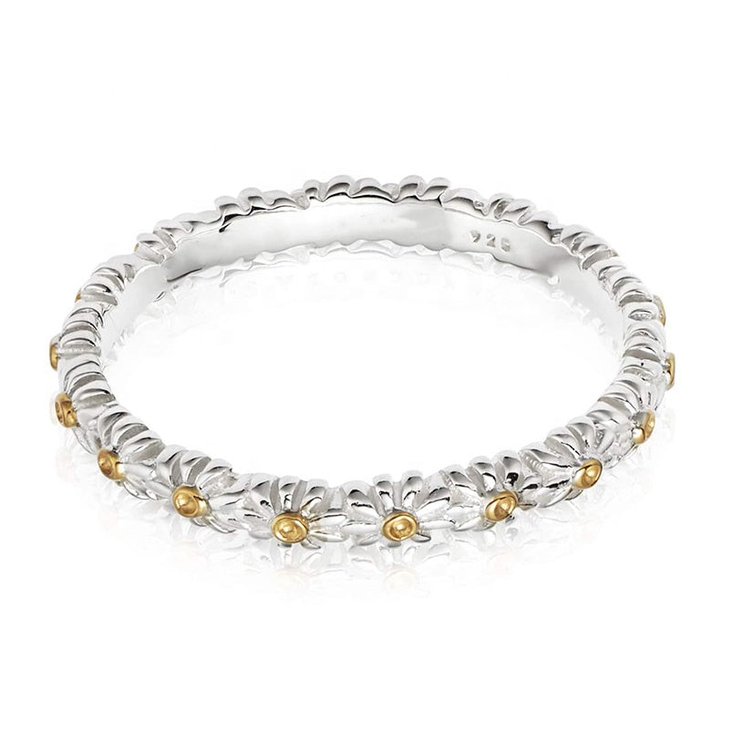 Crafted with precision, this band ring features a delicate daisy flower design in 925 sterling silver, enhanced with 18k gold vermeil and a rhodium plating for lasting shine and durability. Its expert craftsmanship ensures a refined accessory that combines elegance with resilience, perfect for those seeking a sophisticated yet timeless piece.
