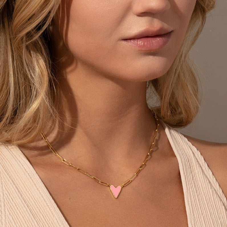 This elegant necklace features a 925 silver paperclip chain plated with 14k gold, combining durability with a luxurious finish. The custom enamel heart pendant adds a unique, artistic touch, making it a refined accessory for women seeking both style and quality. Perfect for layering or wearing alone, this piece offers versatility and timeless appeal.