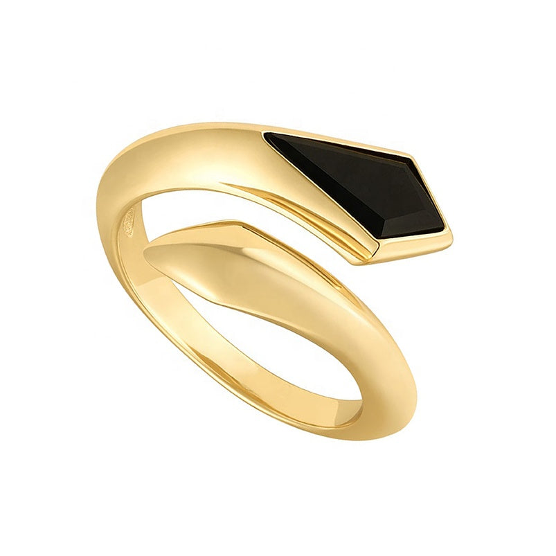 Elevate your accessory collection with this gold-plated stacking ring featuring a sleek geometric design accented by black agate and pave detailing. Its adjustable band ensures a comfortable fit, making it ideal for layering or wearing alone as a statement piece. Crafted to combine contemporary style with versatile wearability.