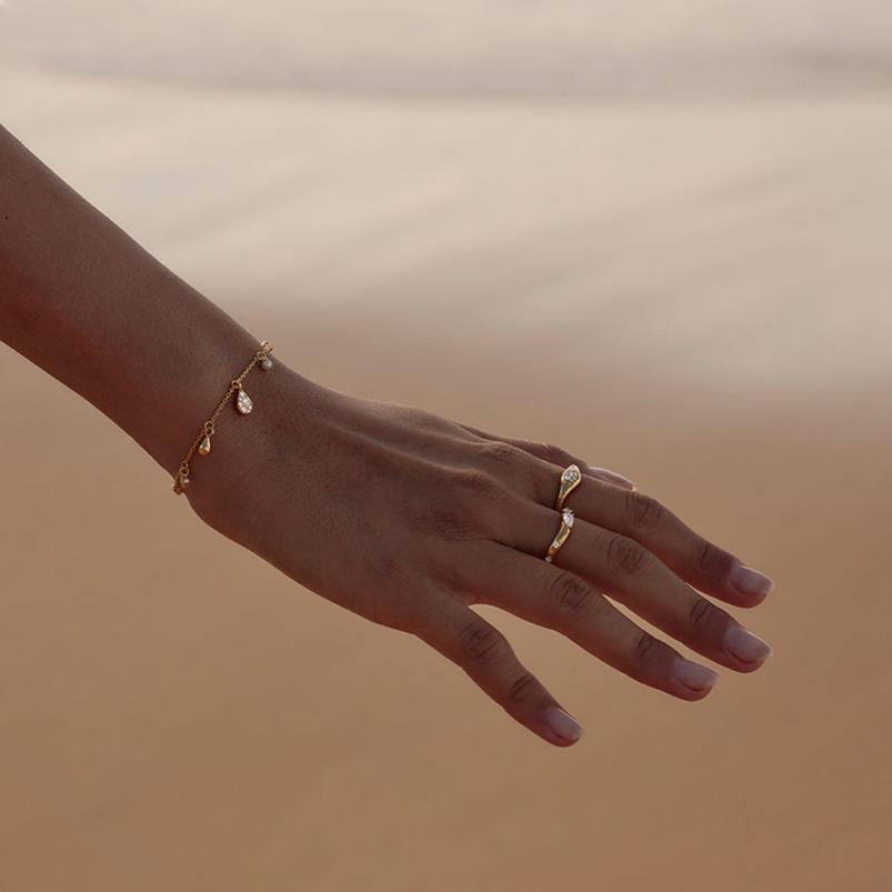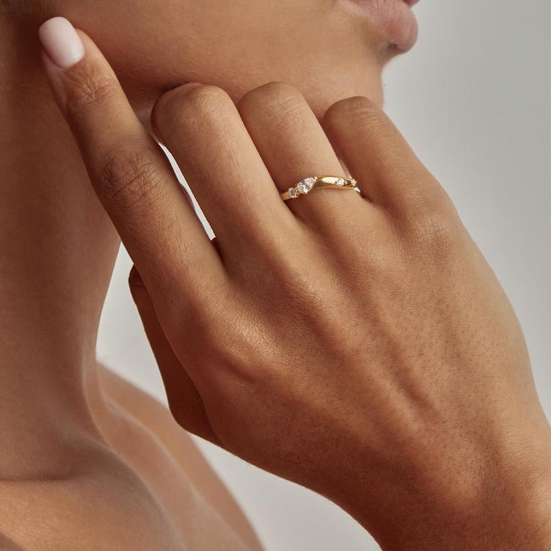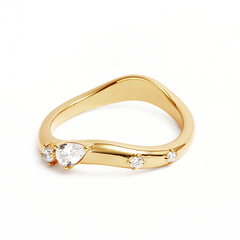 This 18K gold-plated ring captures the dynamic beauty of the ocean with its chasing tides design, featuring an undulating form that mimics the movement of waves. Adorned with sparkling zircon stones, it reflects the shimmering sea view, offering a sophisticated accessory that combines elegance with a natural, fluid aesthetic. Perfect for those who appreciate finely crafted jewelry inspired by the sea’s ever-changing tides.